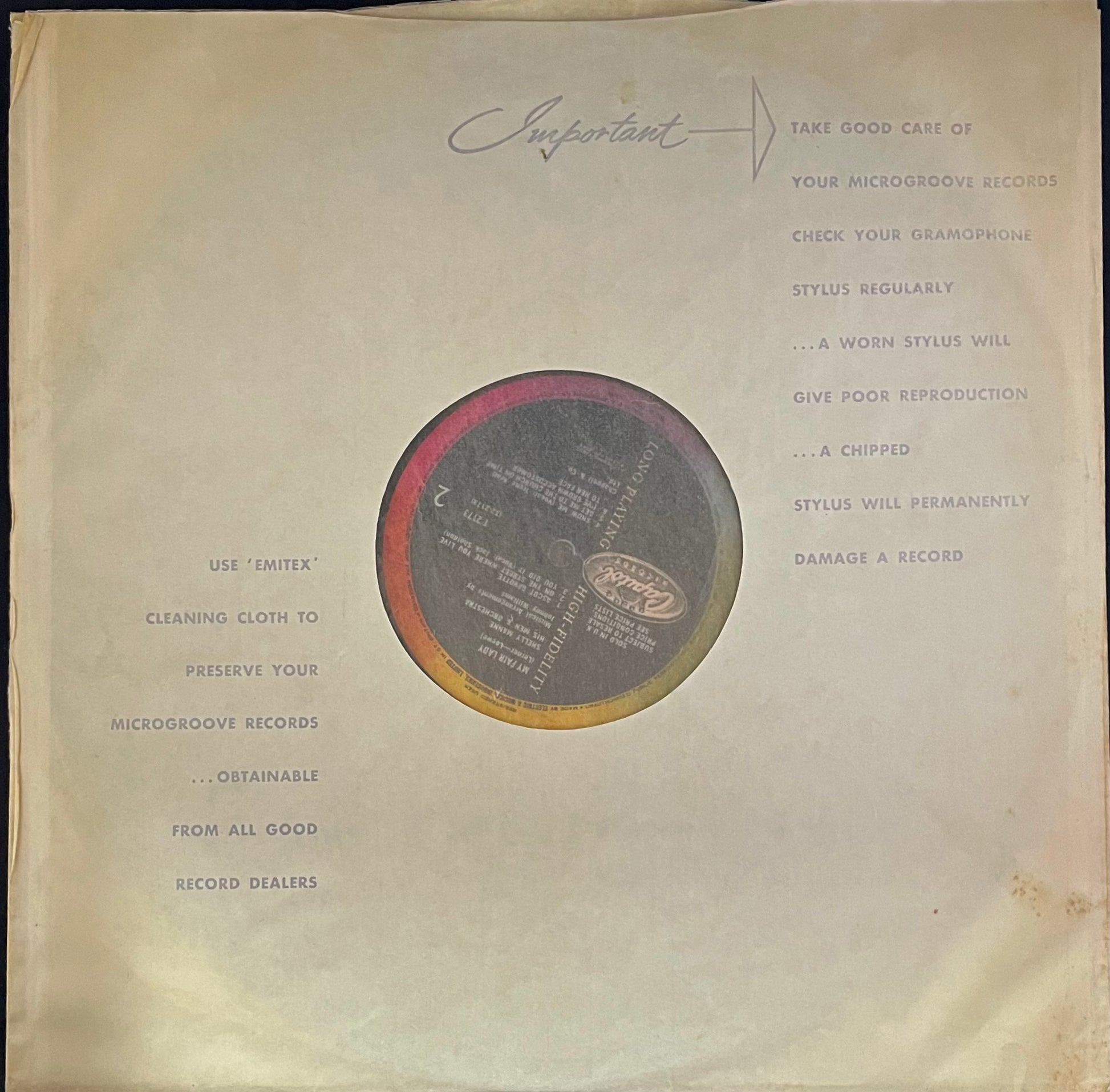 | Very Good (VG) | The record has obviously been played many times, but displays no major deterioration in sound quality, despite noticeable surface marks and the occasional light scratch. Normal wear and tear on the cover or extra items, without any major defects is acceptable |