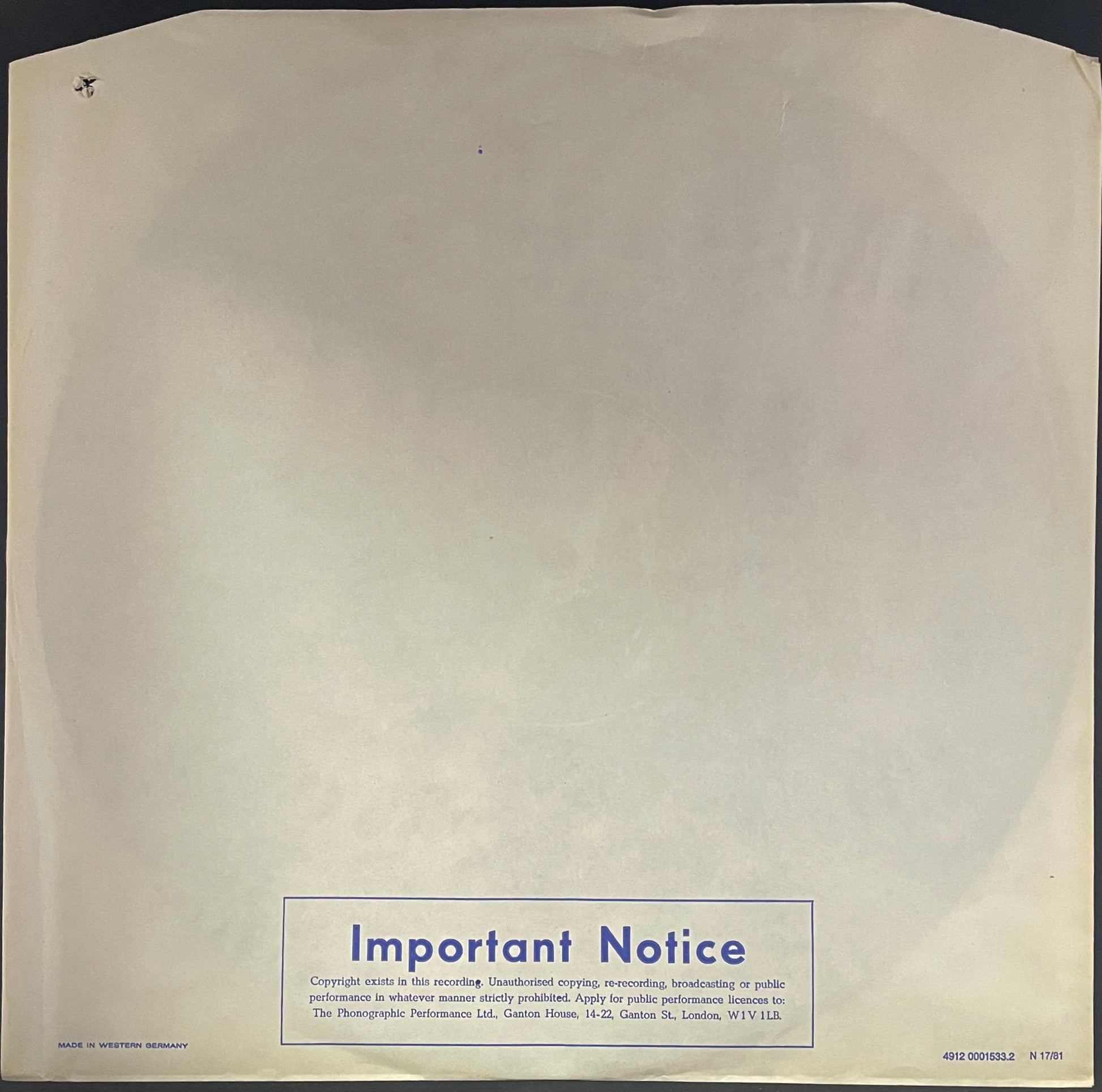 | Very Good (VG) | The record has obviously been played many times, but displays no major deterioration in sound quality, despite noticeable surface marks and the occasional light scratch. Normal wear and tear on the cover or extra items, without any major defects is acceptable |